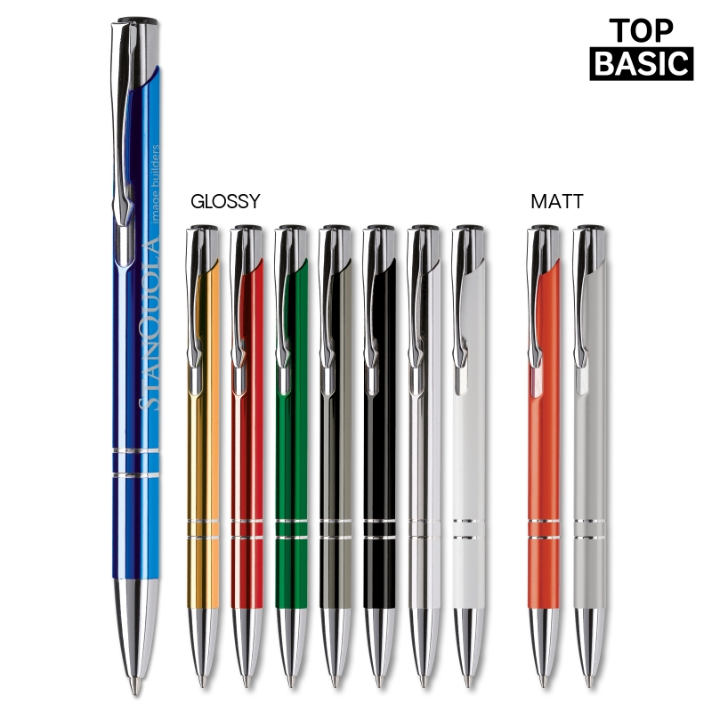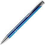 Elegante aluminium balpen. Met twee ringen in het lichaam van de pen als opmerkelijk detail. Blauwschrijvende plastic vulling.