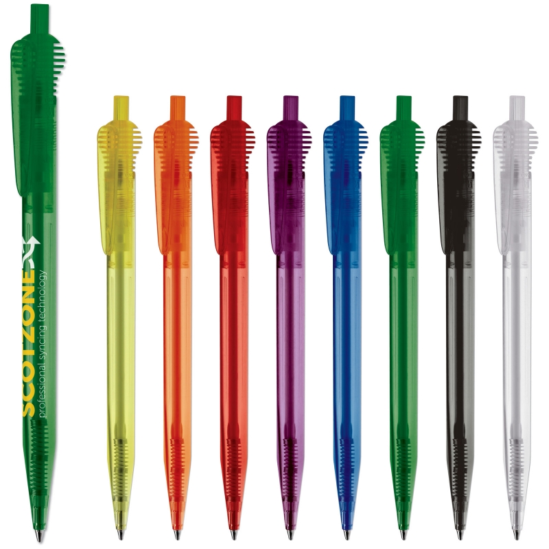 Slanke balpen met ronde bolclip. Unieke balpen. Met kunststof X20 vulling voor 2,5 kilometer schrijfplezier. Transparant.