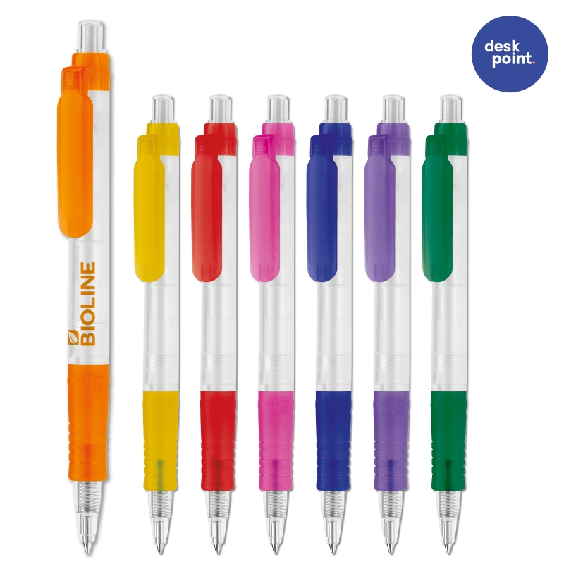 Biologisch afbreekbare, milieuvriendelijke balpen. Blauwschrijvend. Vanaf 5.000 stuks eigen kleurcombinatie en keuze schrijfkleur mogelijk. Frosty delen.