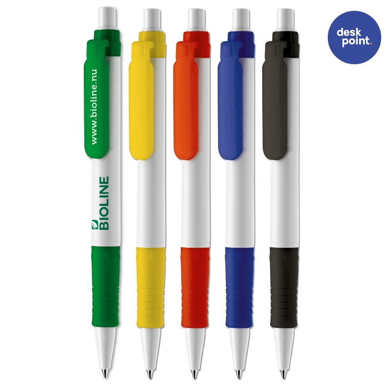 Biologisch afbreekbare, milieuvriendelijke balpen. Blauwschrijvend. Vanaf 5.000 stuks eigen kleurcombinatie en keuze schrijfkleur mogelijk. Met X20 vulling. Hardcolour.