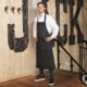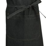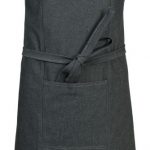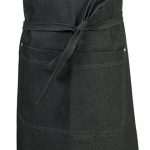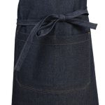 Denim halterschort voorzien van een dubbel opgestikte zak met rivetten en een verstelbare nekband door middel van een jeansknoop. Het model heeft extra lange strikbanden waardoor het schort aan de voorkant gestrikt kan worden.