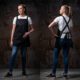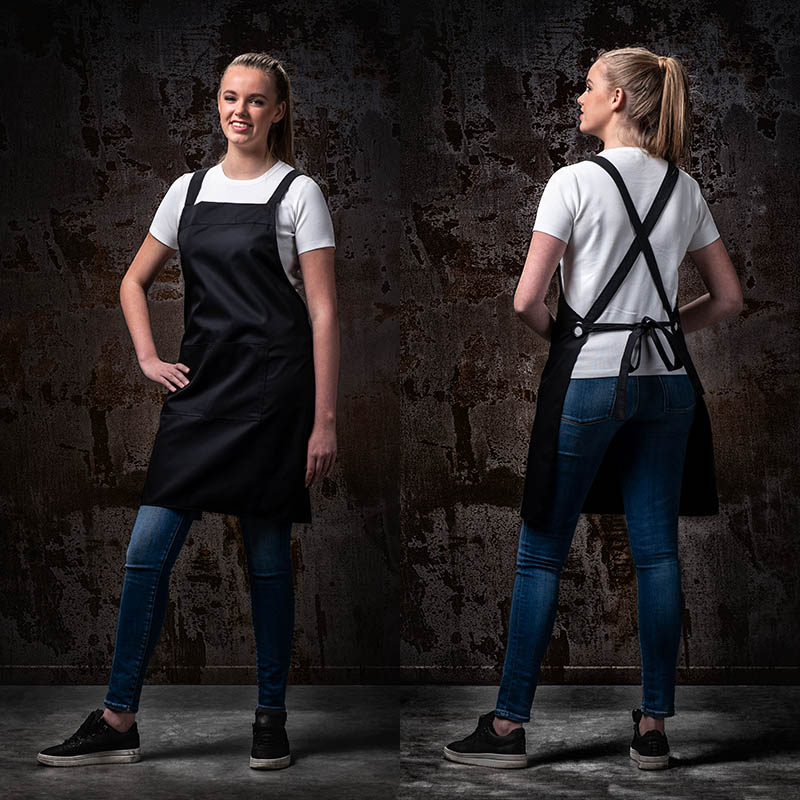 Halterschort met vaste kruisbanden en vierkante zak dubbel opgestikt.
