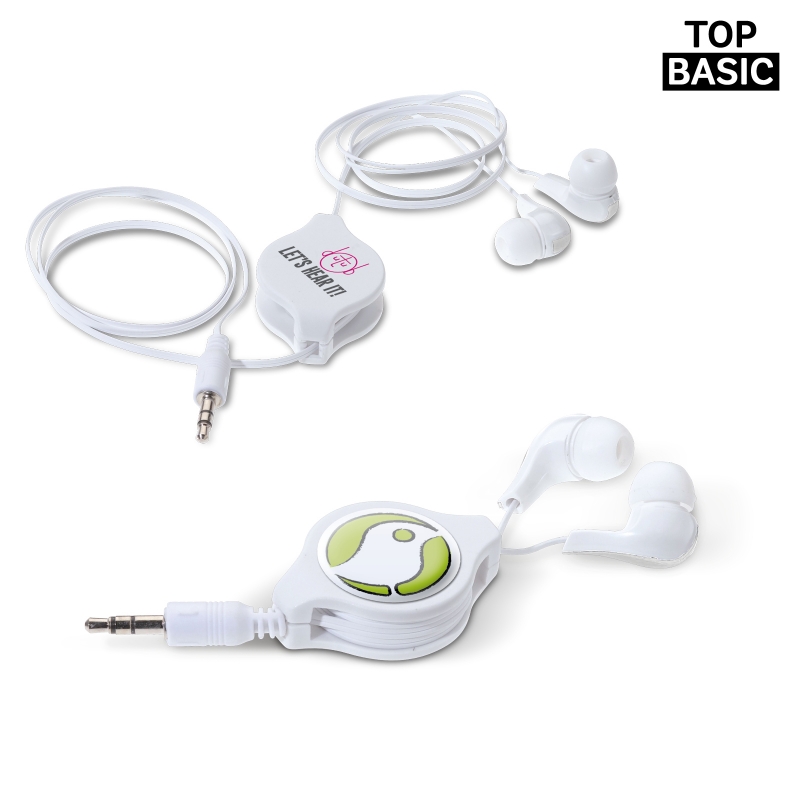 Uittrekbare oordopjes. Middels het uittrekbare mechanisme raken uw oordopjes nooit meer in de knoop. Eén zijde kan worden voorzien van doming sticker.