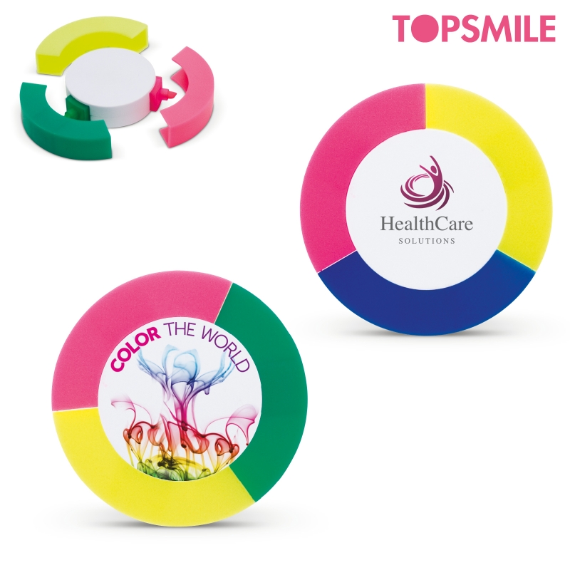 Ronde TopSmile design tekstmarker met drie schrijfkleuren. Groot drukoppervlak op het witte gedeelte. Bedrukking ook mogelijk via digitaal druk of met een doming.