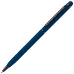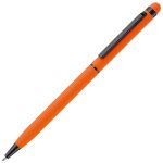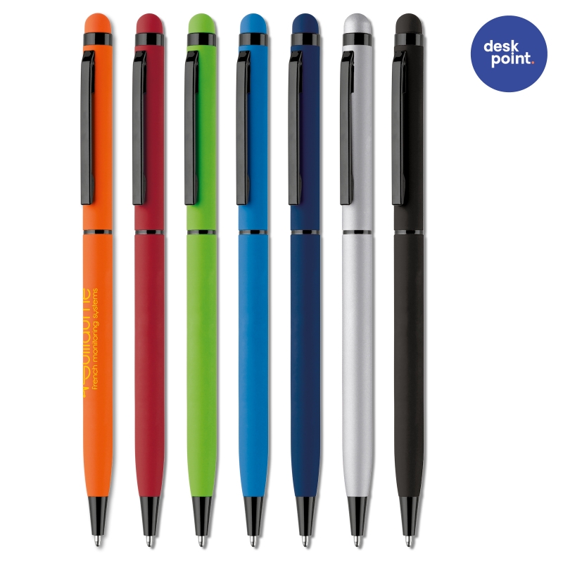 Moderne slanke aluminium balpen met stylus functie. De balpen heeft een rubberised softtouch afwerking en is voorzien van zwarte clip, ring en punt. Pen is voorzien van draaimechanisme.