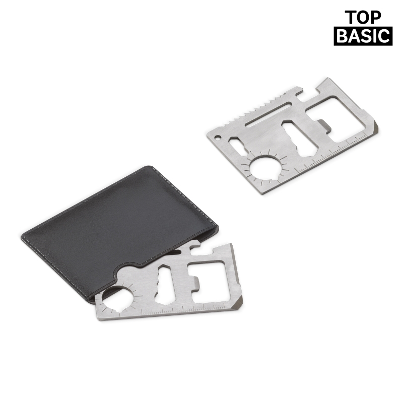 De 11-in-1 multitool van edelstaal is een handige tool in creditcard formaat. De multitool wordt geleverd in een PU hoesje (met instructiekaartje) en kan ook eenvoudig in de portemonnee gedragen worden. Hiermee heeft u altijd een aantal nuttige tools op zak.