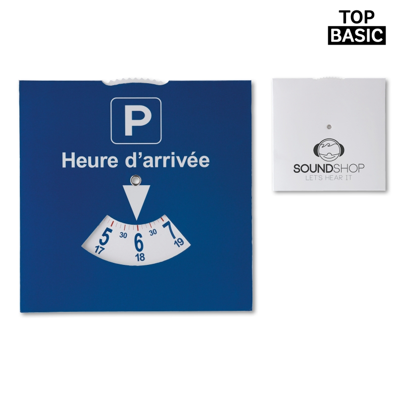 Papieren parkeerschijf die aan de wetgevingen van Frankrijk voldoet. Groot bedrukkingsoppervlak op de achterzijde van de parkeerschijf.