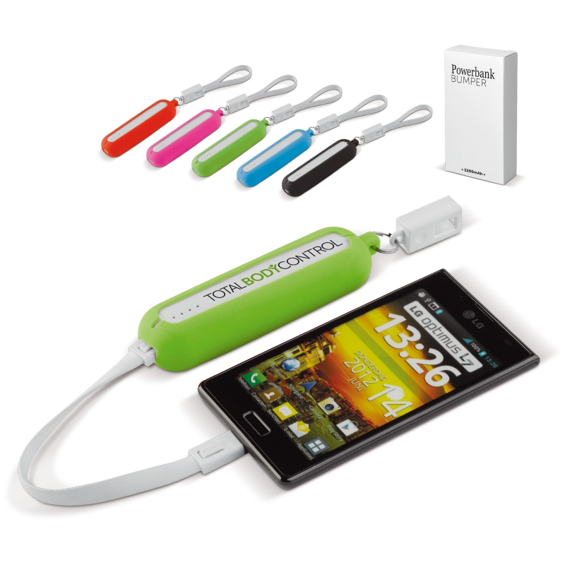 2200mAh Powerbank met siliconen bumper. Wordt geleverd inclusief kabel om de powerbank op te laden. Per stuk in doosje verpakt.
