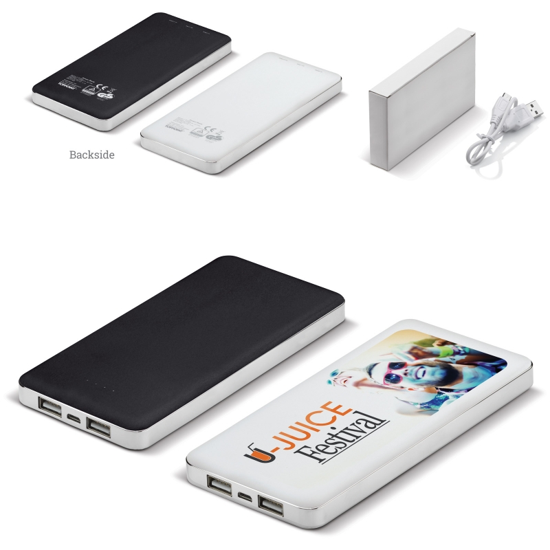 Platte 11000mAh powerbank met dubbele USB uitgang om 2 mobiele apparaten op te laden. Zeer grote capaciteit. Groot drukoppervlak voor digitale full colour bedrukking. Wordt geleverd inclusief kabel om de powerbank op te laden. Per stuk in doosje verpakt. Deze powerbank beschikt over een officieel TÜV Geprüfte Sicherheits-keurmerk.