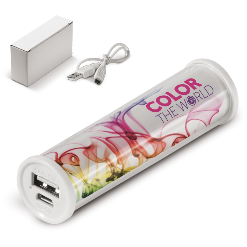 Powerbank (2200mAh) met een full colour papieren inleg. Rond model inclusief USB – micro-USB oplaadkabel. Wordt per stuk in een doosje geleverd.