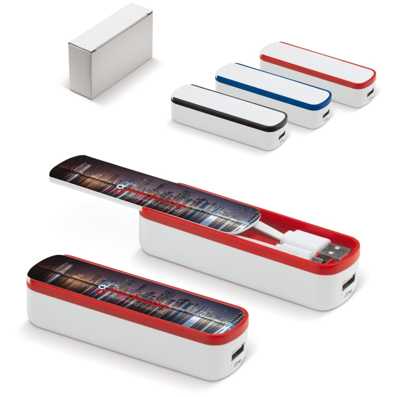 De Powerbank Slide-n-Charge 2200mAh heeft geïntergreerd opbergvak voor de oplaadkabel. Wordt geleverd in geschenkverpakking. Ideaal voor digitale druk.