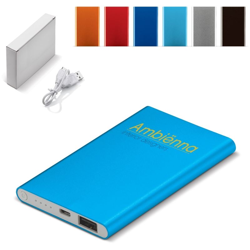 Mooie platte aluminium 4000mAh powerbank. Wordt geleverd inclusief kabel om de powerbank op te laden. Per stuk in doosje verpakt.