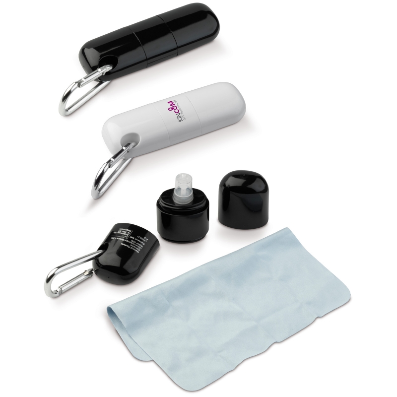 Handige dispencer met een microvezeldoekje van 15x15cm en 8ml reinigingsspray. Voorzien van karabijnhaak. Maak uw smartphone of tablet gemakkelijk schoon en hang de spray op aan je tas.