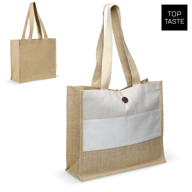 Natuurlijke shopper van jute en canvas met een knoop gemaakt van kokosnoot. De brede schouderbanden maken het bijzonder draagbaar en door de gelamineerde binnenkant is deze tas veilig om etenswaren in te vervoeren.