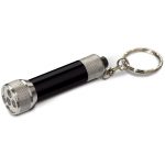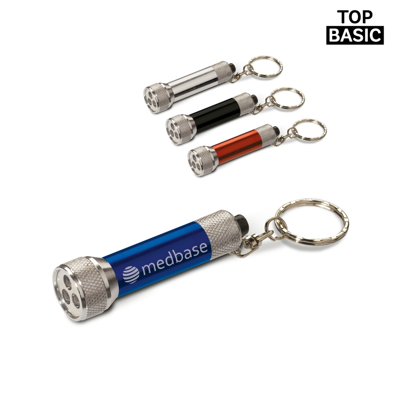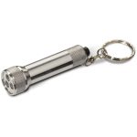 Metalen sleutelhanger met klein zaklampje. Drie kleine LED lampjes, zorgen voor voldoende licht om bijvoorbeeld het sleutelgat te kunnen vinden. Inclusief batterijen.