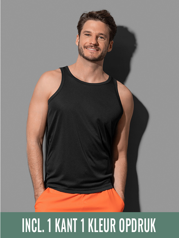 De tanktop interlock Active-Dry voor heren. De tanktop heeft een zacht en licht glanzende stof, zijnaden, een reflecterend Active-Dry logo in de nek en hals en armgaten met een band.