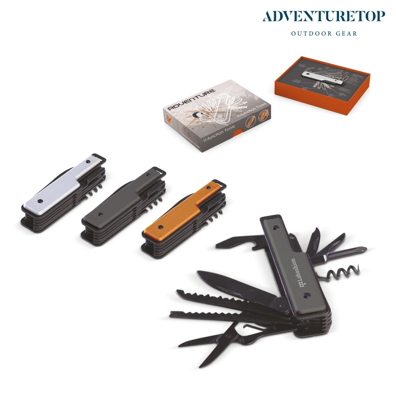 Dit zakmes met maar liefst elf functies is handig en komt in vernieuwend AdventureTop design. Laat uw geschenk opvallen door een bestaand product te geven in een nieuw en uniek design. Met mes, zaag, schaar, opener, schroevendraaiers, priem, vijl, kurkentrekker en naald met oog.